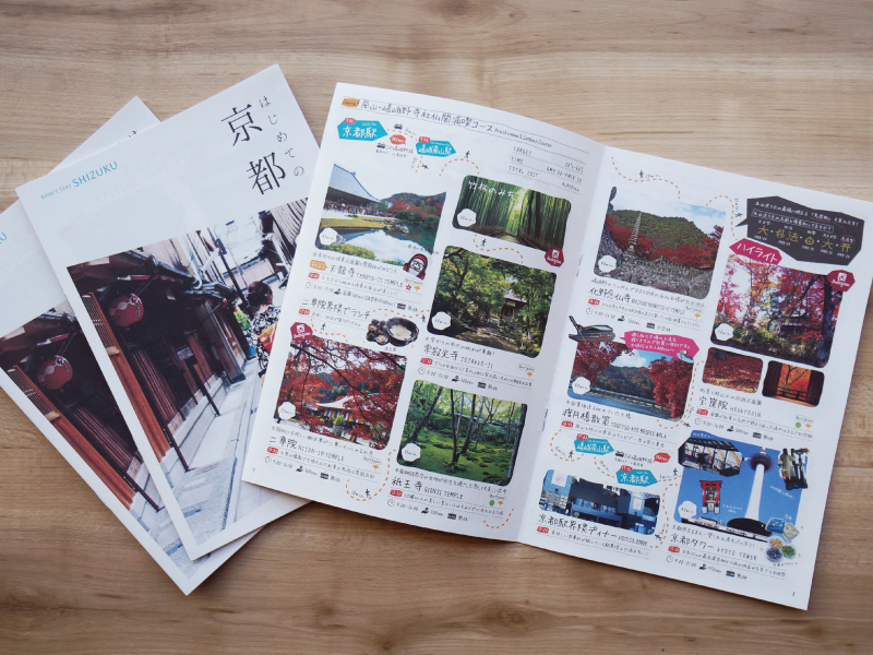 お客様のホテルを起点に周辺の観光スポットをご紹介できます。その他、インバウンドのお客様も楽しめるよう二か国語(日本語・英語)で表現し、持ち運びやすい大きさで制作しております。